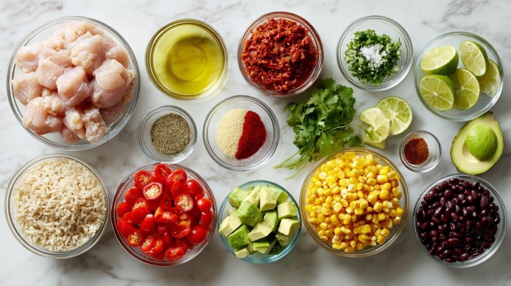 6. Layer smartly: Build bowls base-to-top: rice/beans first for stability, then veggies/chicken/avocado. This keeps textures crisp in meal prep.