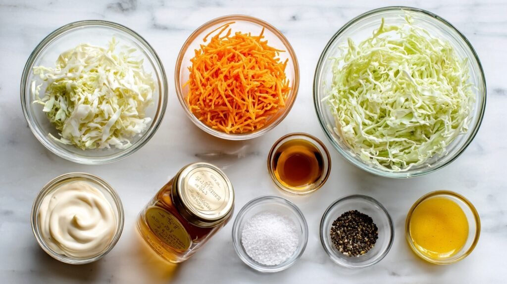 These ingredients harmonize brilliantly in American Coleslaw: crisp cabbage and sweet carrots provide unbeatable crunch, while mayonnaise delivers creaminess. Apple cider vinegar adds bright tang, sugar balances it sweetly, and Dijon mustard brings sophisticated depth—salt and pepper tie it all together for a dressing that’s addictive and fresh.