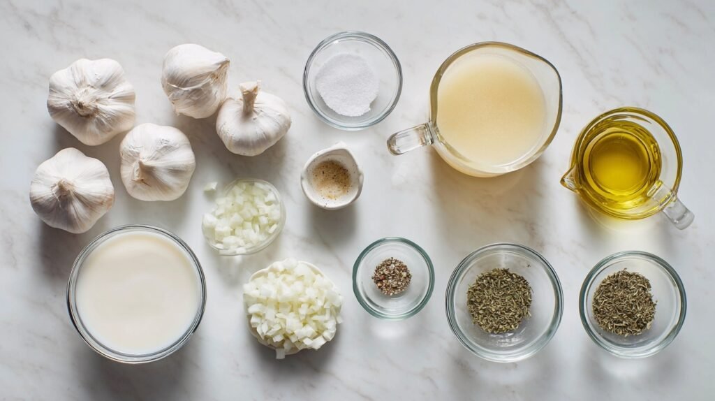 These few ingredients work like magic together: slow-roasted garlic becomes sweet and nutty, onions add a caramel backbone, and the cream smooths everything into a satin-rich sip. Olive oil brings golden roasting and a glossy finish, while thyme lifts the flavor with bright herbal notes.