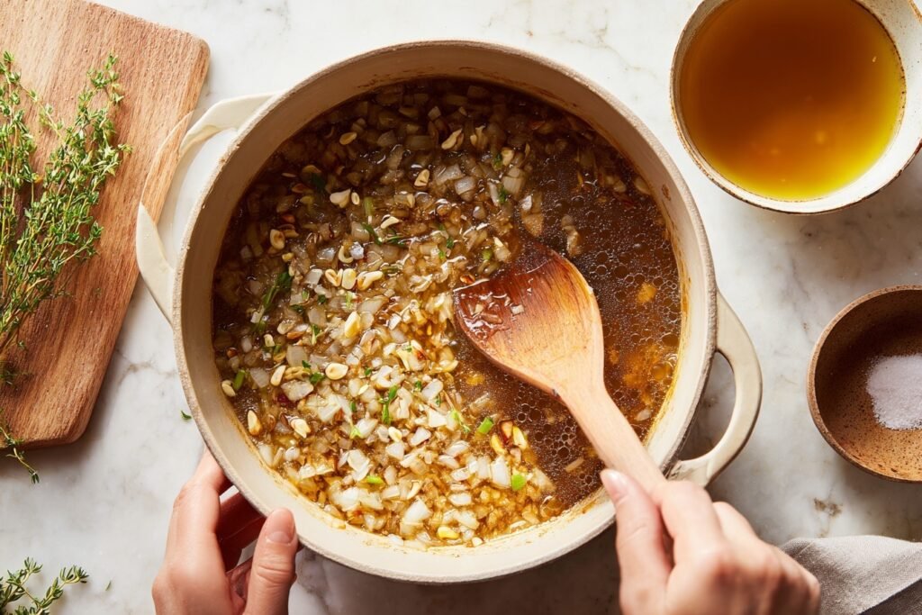 5. Pour in the vegetable broth and add thyme. Bring to a gentle simmer, scraping the bottom for any caramelized bits. Simmer for 10 minutes to let the flavors meld and the broth slightly reduce.