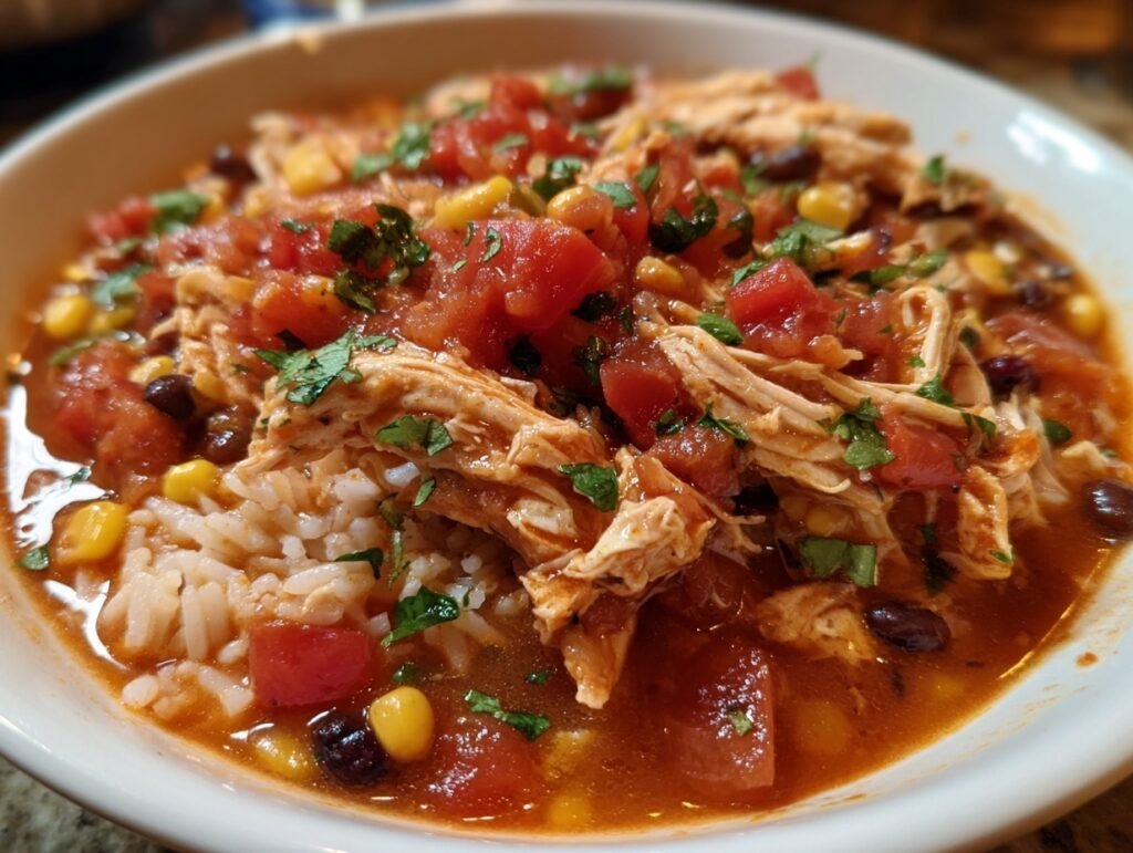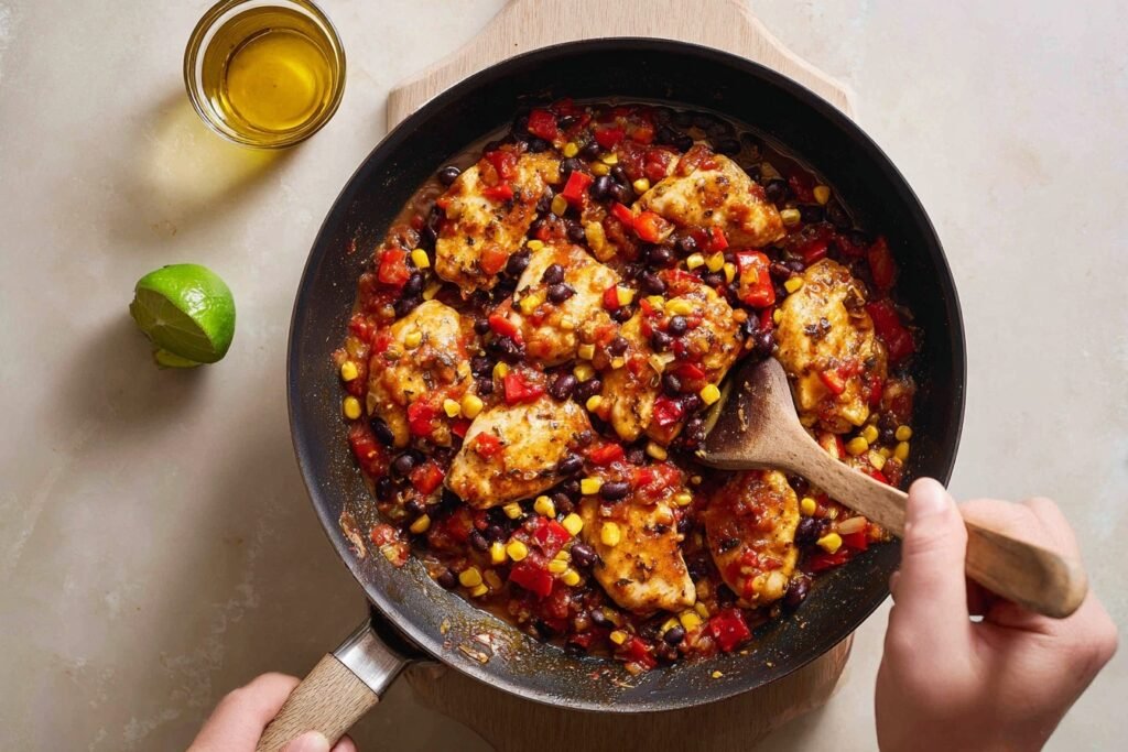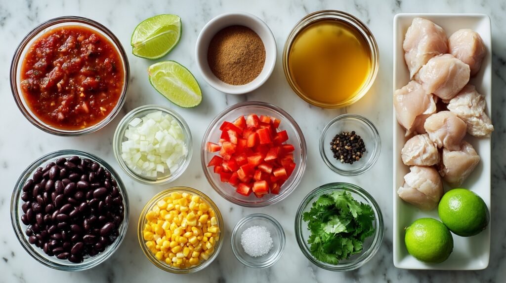 These ingredients harmonize perfectly: juicy chicken breasts soak up the chunky salsa’s bold tomato-chili base, while cumin and chili powder add smoky depth. Black beans and corn bring earthy heartiness and sweet pops of color, balanced by lime’s bright zing and fresh cilantro’s herbaceous lift. Onion, garlic, and bell pepper create a savory foundation—simple pantry staples that build explosive flavor.
