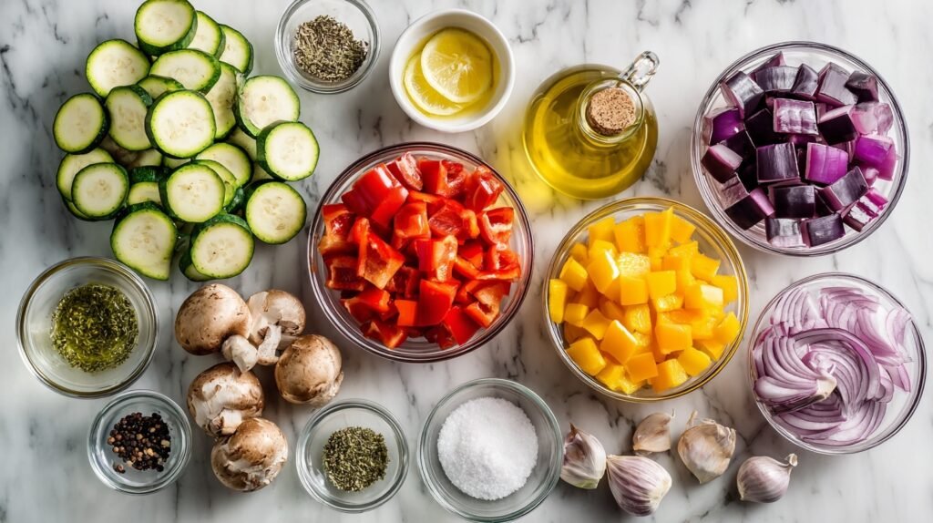These ingredients for Grilled Vegetable Kabobs are a dream team: zucchini and eggplant offer creamy texture, bell peppers and tomatoes add juicy pop, mushrooms bring umami depth, and onion provides sweet crunch. Tossed in a zesty olive oil-lemon-garlic marinade with oregano, they caramelize beautifully, balancing smoky char with fresh brightness.