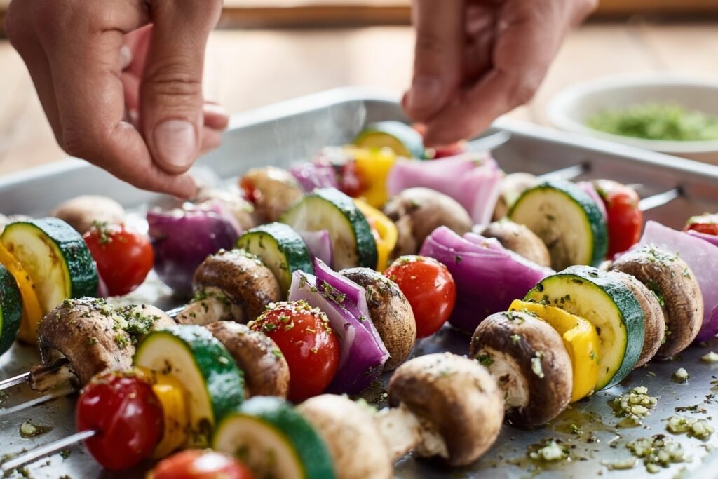 5. Thread the skewers: On 8 metal or soaked wooden skewers, alternate veggies—zucchini, bell pepper, onion, tomato, eggplant, mushroom—for balanced color and flavor. Leave a little space between pieces for even grilling.