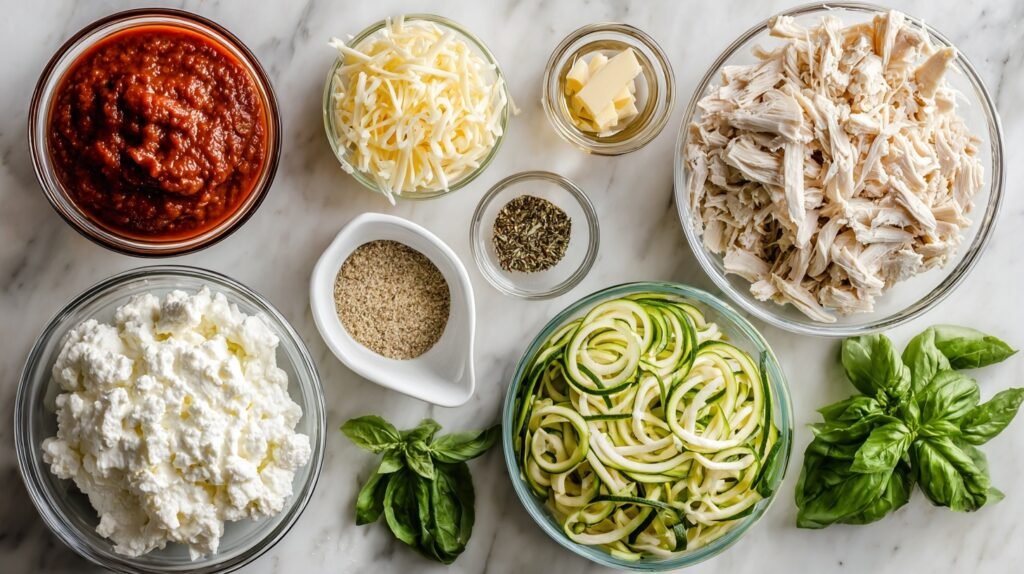 These ingredients blend seamlessly for a protein-packed twist on chicken parm: creamy low-fat cottage cheese adds richness without heaviness, shredded chicken brings tender heartiness, and marinara ties it with bold, herby depth. Mozzarella and Parmesan melt into gooey perfection, while Italian seasoning and garlic amplify savory notes. Whole wheat pasta or zucchini noodles offer hearty texture—fresh basil crowns it all for vibrant, garden-fresh appeal.