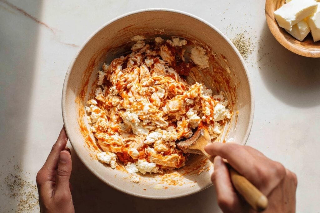 3. Fold in the 4 cooked, shredded boneless skinless chicken breasts into the cottage cheese mixture. The chicken absorbs the creamy tang, creating a protein-rich base that’s juicy and flavorful.