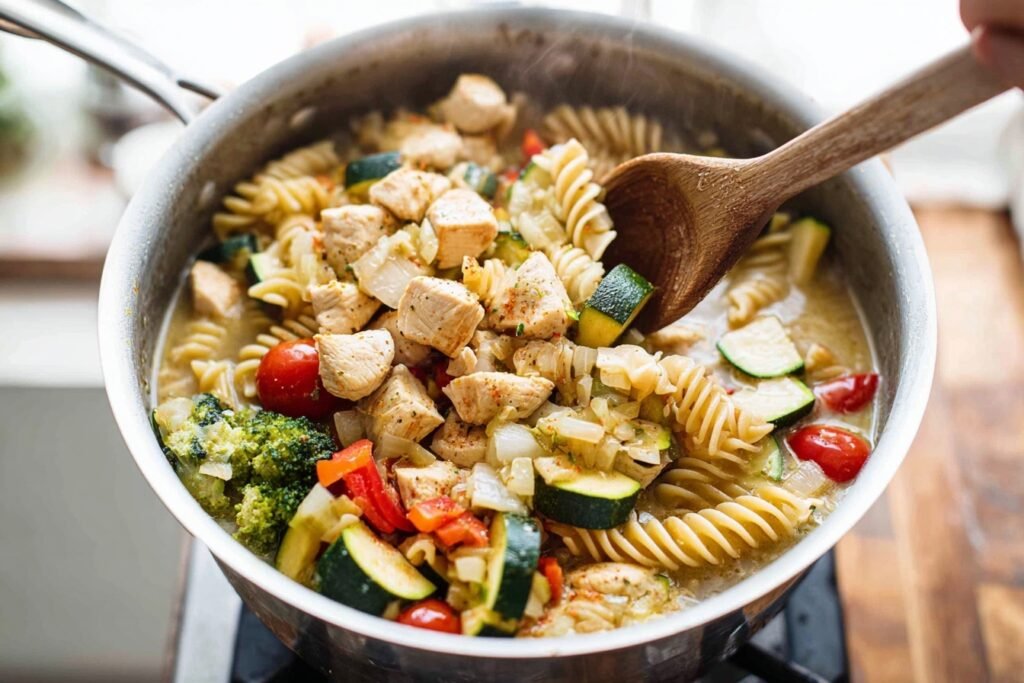 These ingredients harmonize beautifully: lean chicken provides protein punch, while mixed veggies like zucchini, bell peppers, and cherry tomatoes bring vibrant color, crunch, and natural sweetness. Creamy heavy cream and Parmesan create luxurious sauce, balanced by Italian seasoning’s herby warmth and pasta’s comforting bite. Chicken broth ties it all with savory depth—fresh, wholesome perfection in one pan.