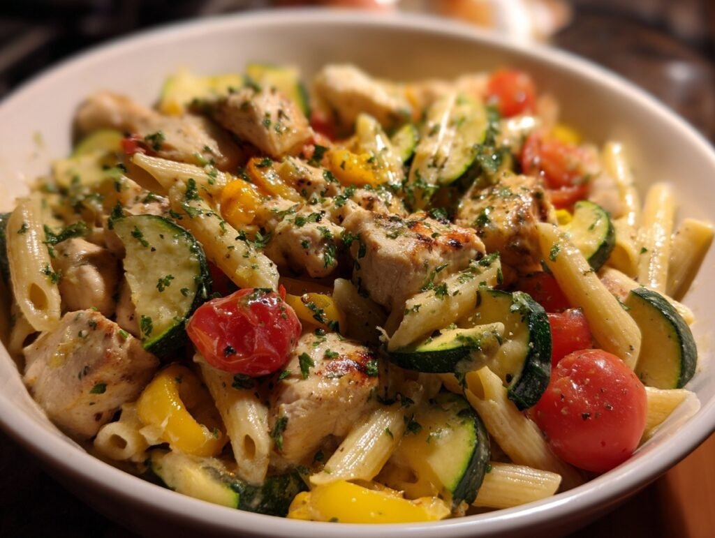 10. Garnish with chopped fresh parsley for a pop of green. Serve immediately, twirling pasta strands loaded with colorful veggies and juicy chicken.