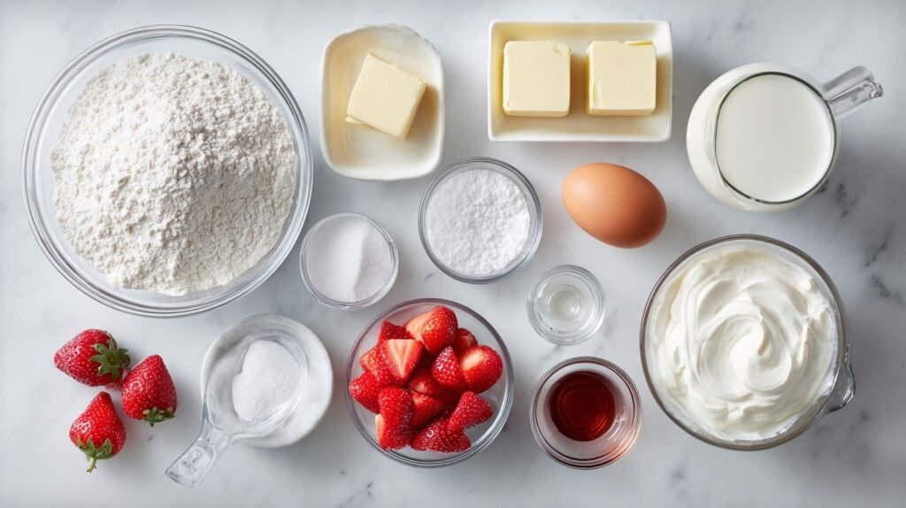 These ingredients harmonize beautifully: tender shortcakes from flour, butter, and milk provide a flaky base; fresh strawberries macerated in sugar release juicy sweetness; and homemade whipped cream adds airy luxury. Simple, fresh elements create contrasting textures—crisp biscuit, soft berries, creamy topping—for an unforgettable Strawberry Shortcake.