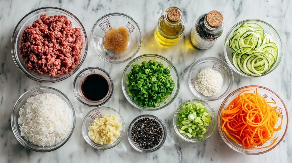 These ingredients harmonize brilliantly: lean ground beef soaks up the umami-packed soy sauce and brown sugar glaze, while sesame oil and ginger add nutty depth. Fresh garlic, pepper, green onions, and sesame seeds bring zing and crunch. Crisp cucumber and carrots provide cool contrast over fluffy rice—creating a symphony of sweet, savory, and fresh that’s visually vibrant and flavor explosive.